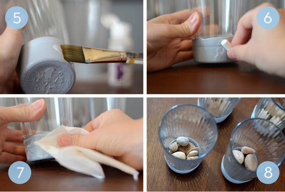 2. Dip the bottom of each glass into the latex paint, creating a 1″ tall coating of paint. Let the excess paint drip off.
