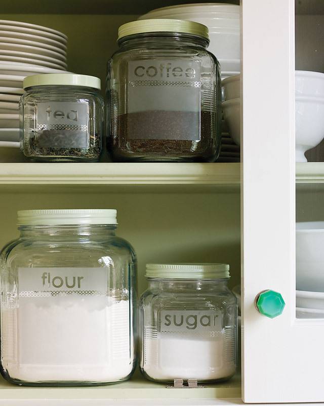 An easy way to store basics like flour and sugar is to pick up a few glass jars at your local craft store. Then check out this little glass etching tutorial using vinyl letter stickers for a great presentation.