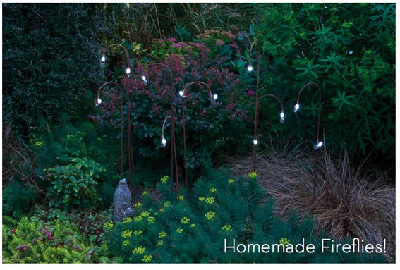 “Dazzle evening garden party guests with a fanciful flight of homemade fireflies. By day the informal cluster of shepherd’s crook–style hooks studded with craft magnets looks like a piece of metal garden art, echoing the rusty color of nearby plantings. But after dusk it’s pure magic. I position LED (light emitting diode) bulbs and lithium coin batteries at each magnet along the hooks and fireflies appear to float above grasses and groundcovers along the edge of my front walkway.