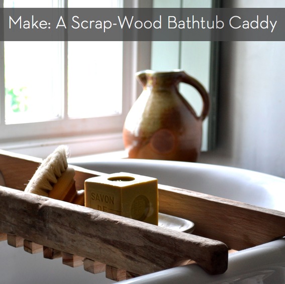 Here it is, as promised! The instructions for how you too can make a scrap-wood bathtub caddy, courtesy of RECYCLED HOME: Transform Your Home Using Salvaged Materials by Rebecca Proctor and published by Laurence King. Rebecca’s tutorial is straight out of the pages of her book, but I’ll add notes in brackets as to how we modified ours (pictured below) to suit our style and standard tub.