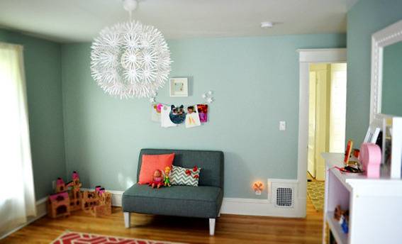 - Wall colors: Blue-ish aqua (“Rainwashed” by Sherwin Williams) and pink (“Lotus Flower” by Sherwin Williams)