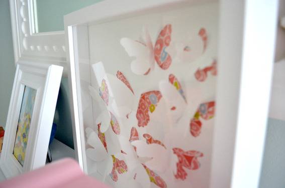 Here’s that scrap of Spoonflower fabric I loved so much. I got the butterfly artwork from Ikea, and took off the back of the frame to swap out the background.