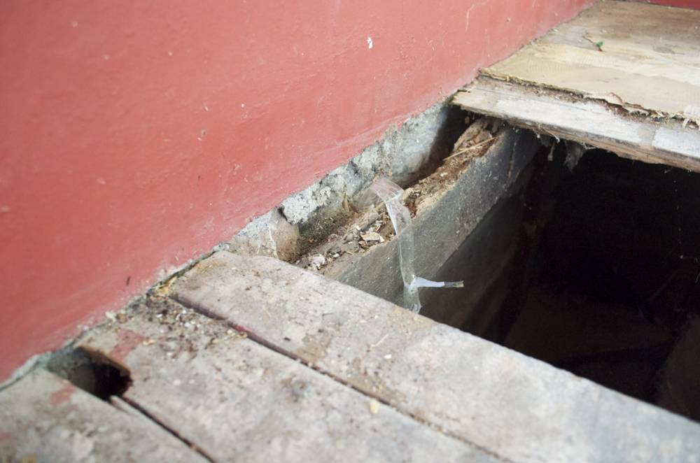 We patched the damaged floorboards with new fir planks and gave the whole thing several coats of clear polyurethane.
