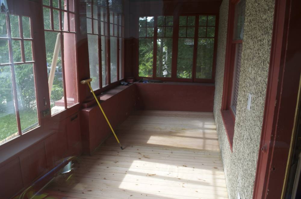 Finally, we decided enough was enough and began bringing the porch back to its original roots. We started the makeover by tearing up the carpet and removing a quarter inch of carpet adhesive. A combination of a frighteningly toxic chemical stripper and four days walking behind an orbital sander did the trick. Note: Upon returning the orbital sander, the nice rental lady informed us that we were given a broken sander by mistake. So, should you choose to take on a project like this, your sanding experience will likely not involve four days of your life.