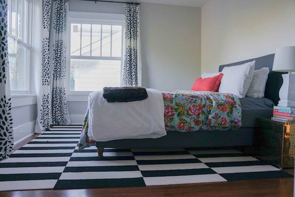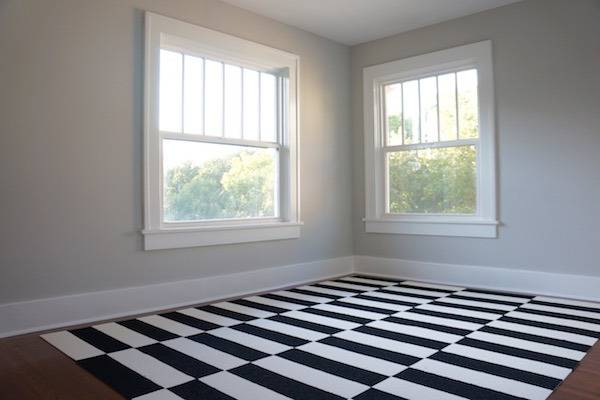 I have always really loved the Ikea Stockholm rug. I know, so does everyone, but there is a reason why. It is a classic and it can fit in any type of room. My guest bedroom needed the 8×10 size but I wanted the 5X7 price or cheaper. I randomly saw an advertisement for my local carpet warehouse saying they had carpet tile for $1.25 a sq/ft. What? I decided to check it out the next day and found materials to make this knock-off Ikea Stockholm rug.