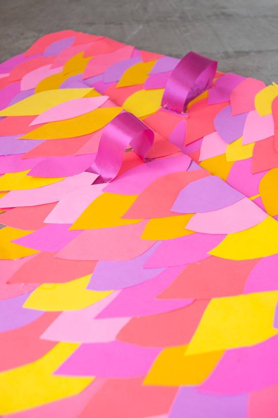 - Add ribbon loops for the arms to go through, but cutting a length of ribbon and glueing to the inside of each wing, as shown. Cover ends with more paper feathers if necessary. I also attached a ribbon strip to the back to connect the feathers to one another. This isn’t required, but it does help to keep the wings from slipping off.