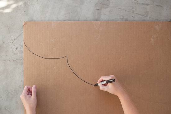 - To create the wings, first draw out a scalloped shape wing onto cardboard. I used the straight edge of the cardboard for the top of the wing and then drew a descending scallop shape for the bottom of the wing. Measurements for the wings will vary based on the height of the person, but my measurements for someone who is 5’6 were as follows: 32 inches wide at the top and 15 inches tall (at its tallest part).