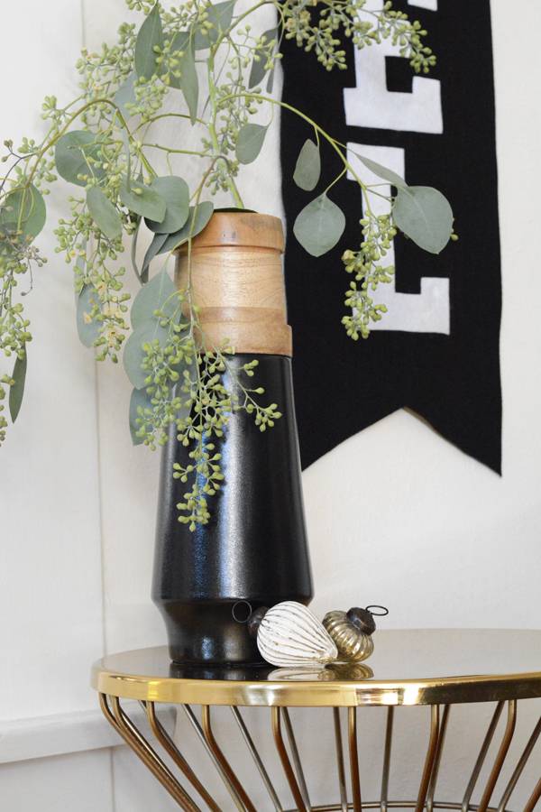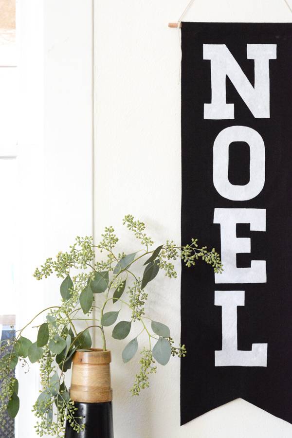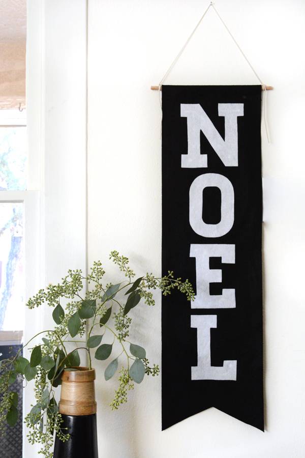 Yep, the season is here and I’m ready to deck. those. halls. Each year, I lean more and more towards minimal Christmas decorations and I love simple black and white with splashes of metallics. I’m a huge fan of a banner or pendant. They are easy to hang and roll up small and compact to pack away for the rest of the year. Banners add a relaxed, informal vibe to a space. This no-sew, narrow NOEL banner is perfect for a tight space. I’m hanging mine on a tiny space on my wall between the door and window.