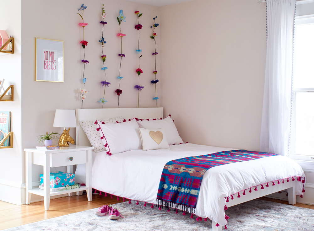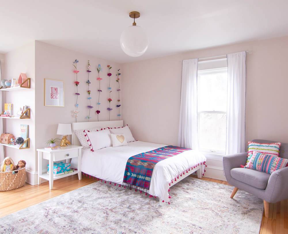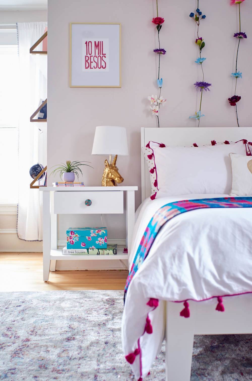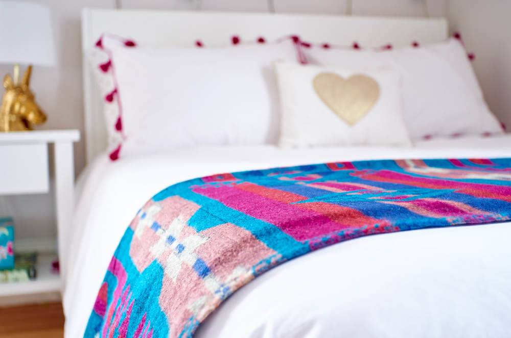 We pulled the colors of the rug out in some clever ways. The fringe on the duvet and pillow cases is a sweet nod to the magenta in the rug. And the bold color palette of the throw at the end of her bed wraps all the colors into one loud, beautiful statement.