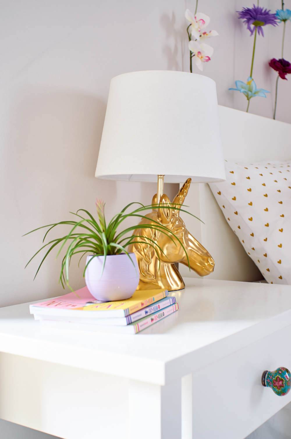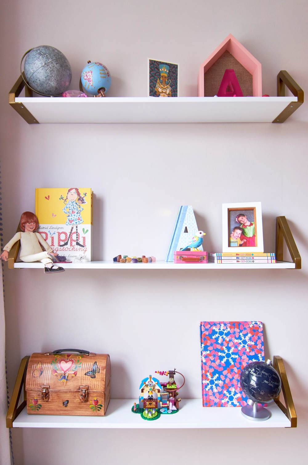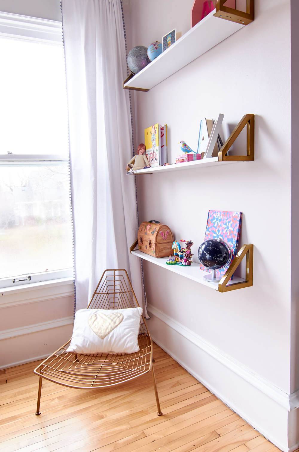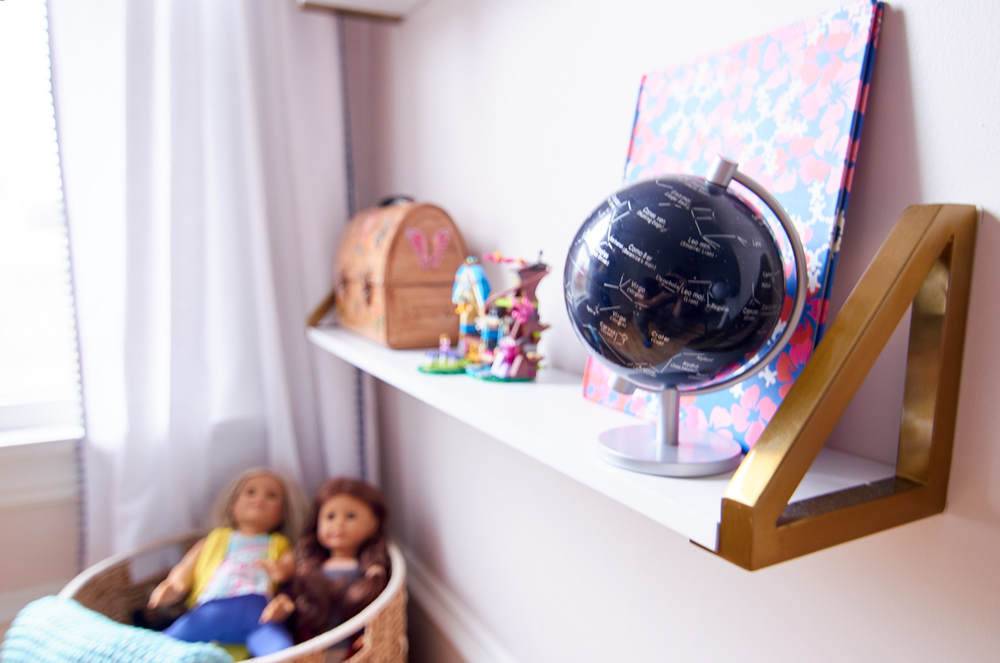We wanted to stick with clean lines and a bright white color when it came to the furniture in her room. But we also wanted to add some warm bronze metallics and wood into the mix. We did this using a combination of Land of Nod shelving, an IKEA bed, and a Target desk.
