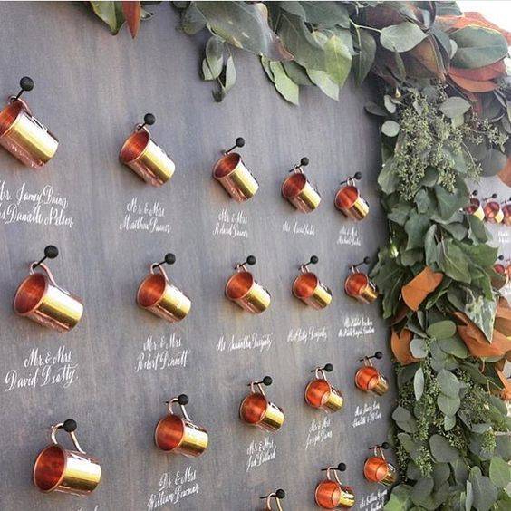 These copper mugs do triple duty as wedding favors, escort cards, and guests’ drinking vessels for the night. Mason jars or other glasses work well too.