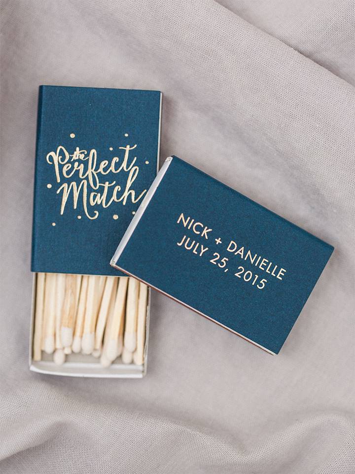 Customized boxes of matches are useful and oh-so-cute, especially with a phrase like “the perfect match.”