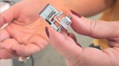Slide the fabric wrong side up, and put the foot’s plastic straight