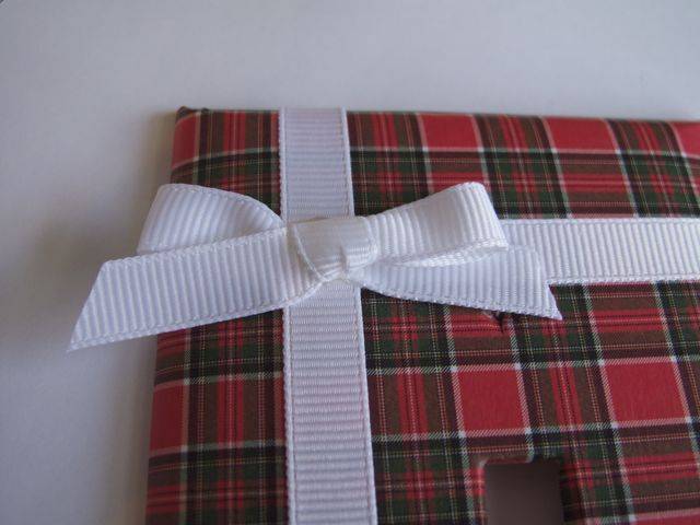 Position the ribbon over the plate using the primary pic as reference, and hot glue them into place at the BACK of the switch plate.
