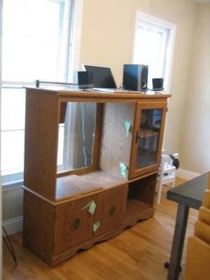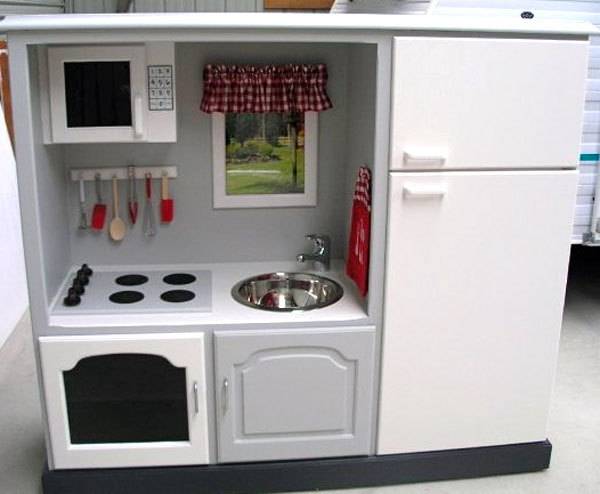 You’ve seen these clunky monsters at Goodwill, garage sales, or possibly in your own basement. I’ve got to say, I never saw this coming. These sturdy, state of the art play kitchens are some of the best examples of furniture re-use I’ve ever seen. See what I mean…This first one was lovingly converted into a cute little red and white kitchen by Milla’s grandma and grandpa. (Can you imagine how much fun they had?)