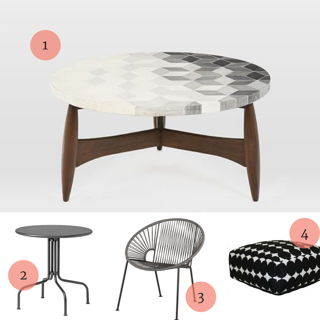 1. A bit of an investment (but on holy-moly sale right now), West Elm’s coffee table is a serious MCM nod to get the party started: Mosaic Tiled Outdoor Coffee Table; Regularly $469, now $281