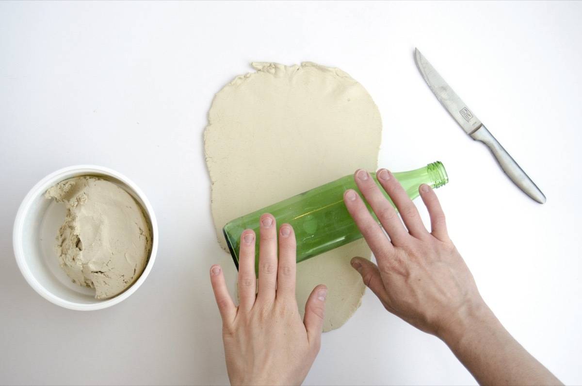 First, roll out a section of air-dry clay, approximately 1/4 inch thick. Use a rolling pin, or a glass bottle. This brand of air-dry clay is non-toxic, so it’s fine to use kitchen tools for this project.