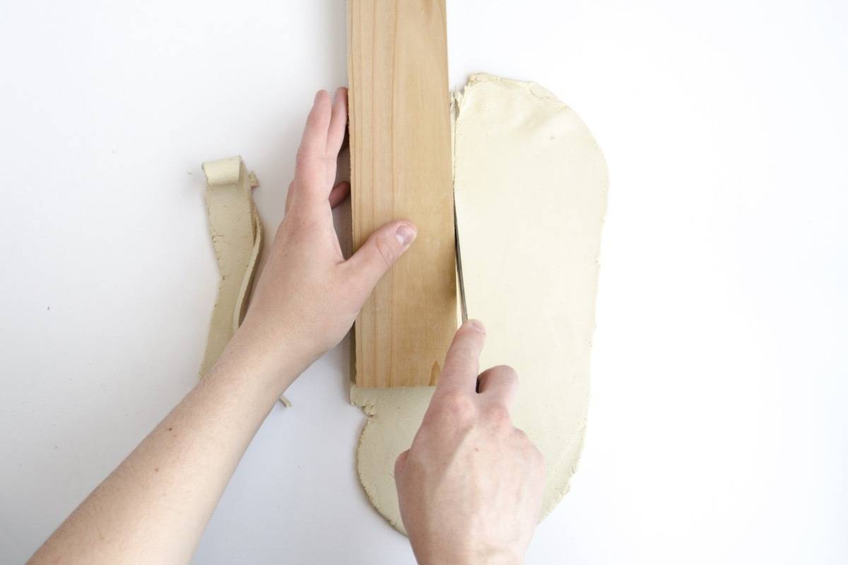 Cut out a few strips of the clay using a knife or clay cutting tool. Make the strips slightly smaller than the width of the wood board. From those strips, cut four triangles of equal size. Use the first triangle you cut as a guide for the last three. Set one triangle aside.