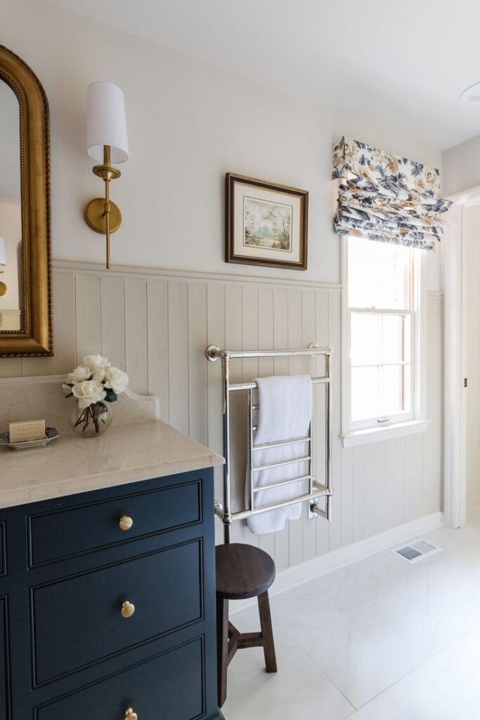 Opting for beadboard in navy blue can create a classic and cozy feel. (Plus beadboard is a great material for humidty-prone spaces.)