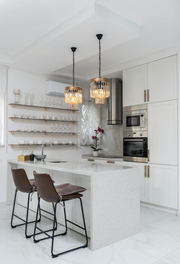 Use L-shaped designs to your advantage with floating shelves or while a small kitchen island can add extra counter and storage space. Consider purchasing a portable island you can move wherever it’s most needed.