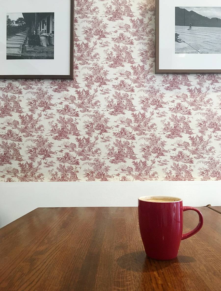 9. Pick a color scheme and stick with it. Neighborhoods Café in Boston chose to go with a dark red color scheme, and they were consistent with it – from the toile wallpaper to the coffee mugs. This would be a nice touch for your kitchen as well… coordinate your dishware with the main color in the room to create a composed feel.