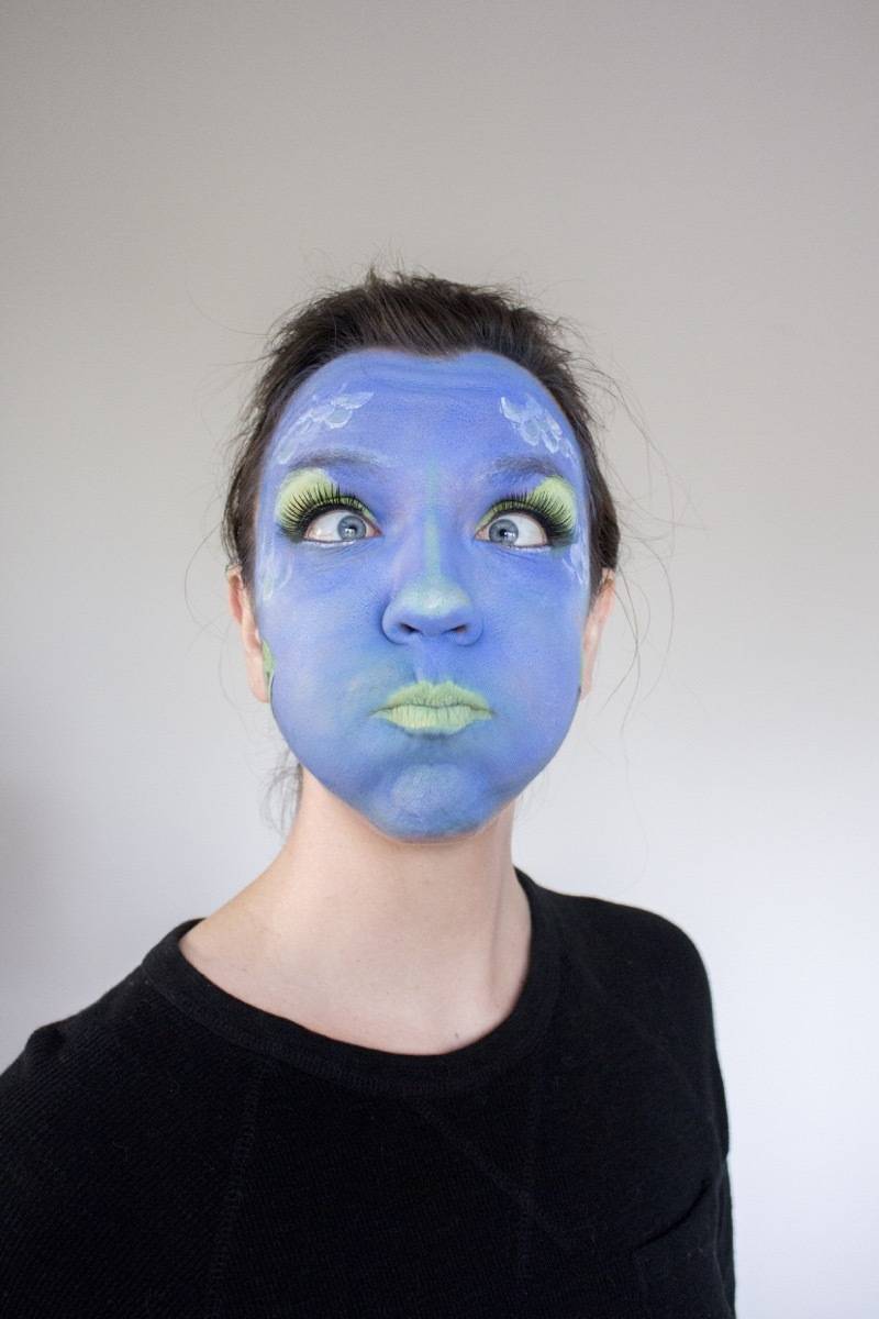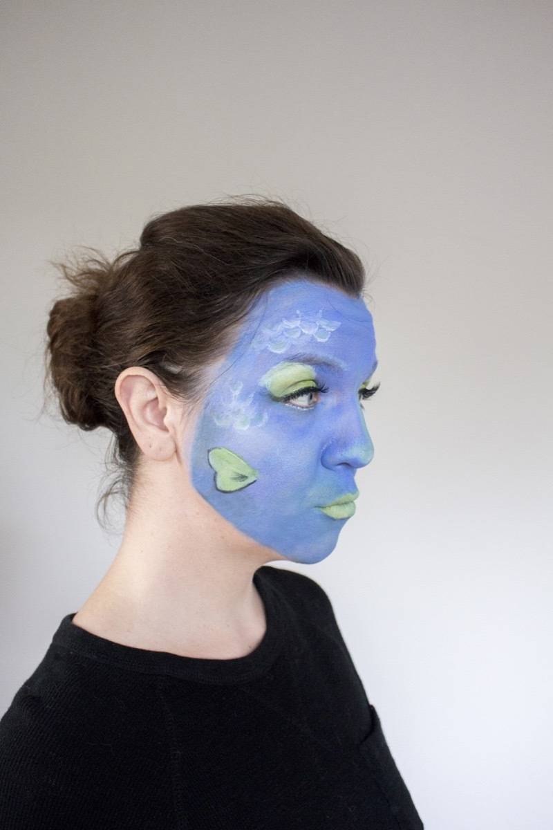5. Tropical fish: Our final face painting look is a little on the fishy side. Start with a blue base, add highlights on the lips and eyes in yellow and green, and draw green fins on the cheeks. Add white scales with a paintbrush, and outline the fins in black.