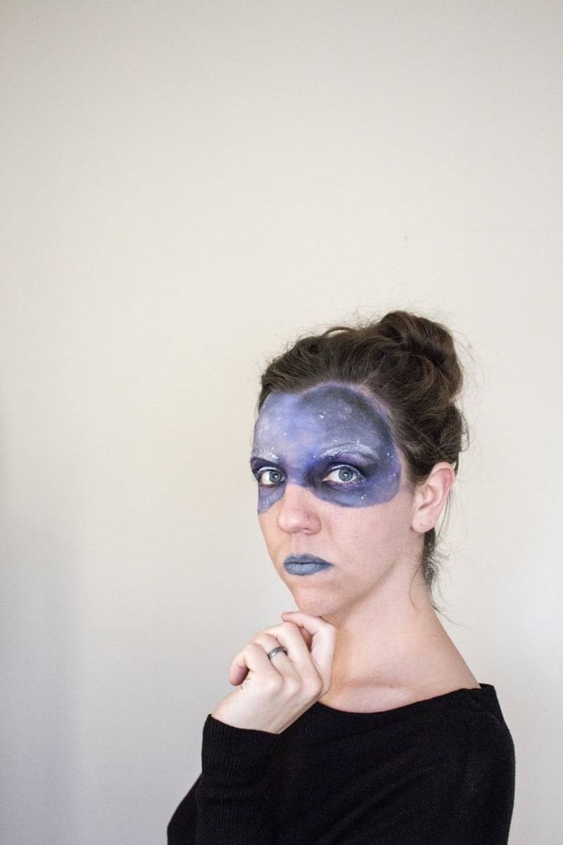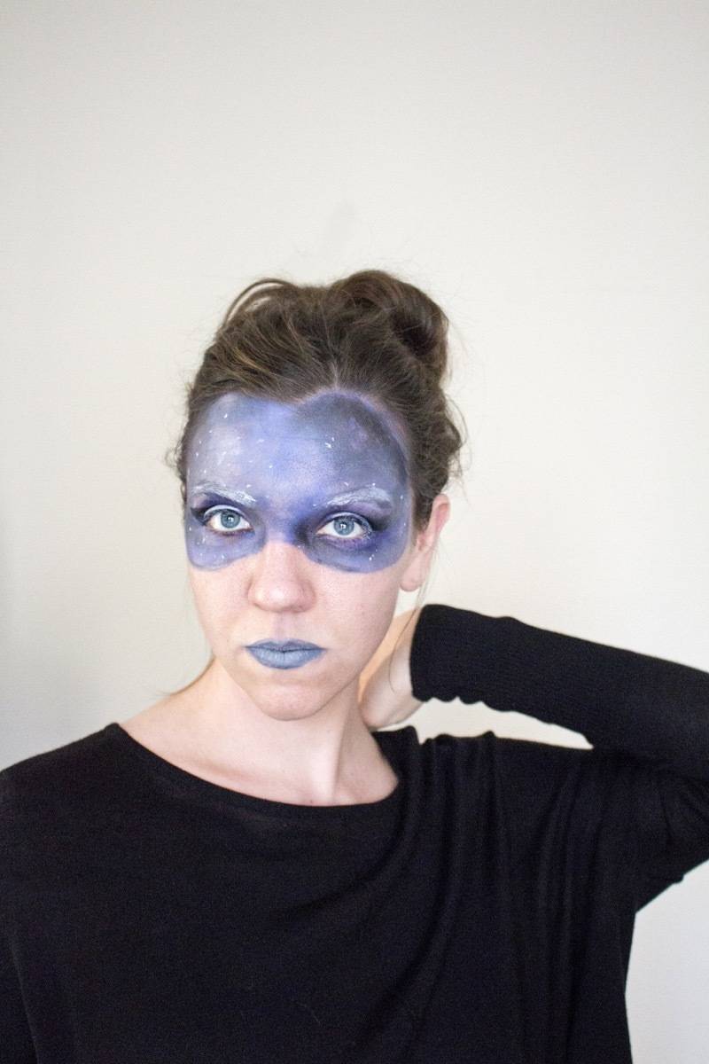 2. Galaxy: This look is great because you can be messy with it and you’ll still look amazing. Apply face paint with a sponge, mixing black, purple, and blue across your face. Use the black paint around your eyes and temples. Add white with a paint brush, dotting in stars and highlighting your eyebrows and eyelids.