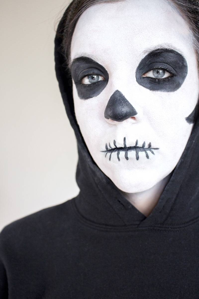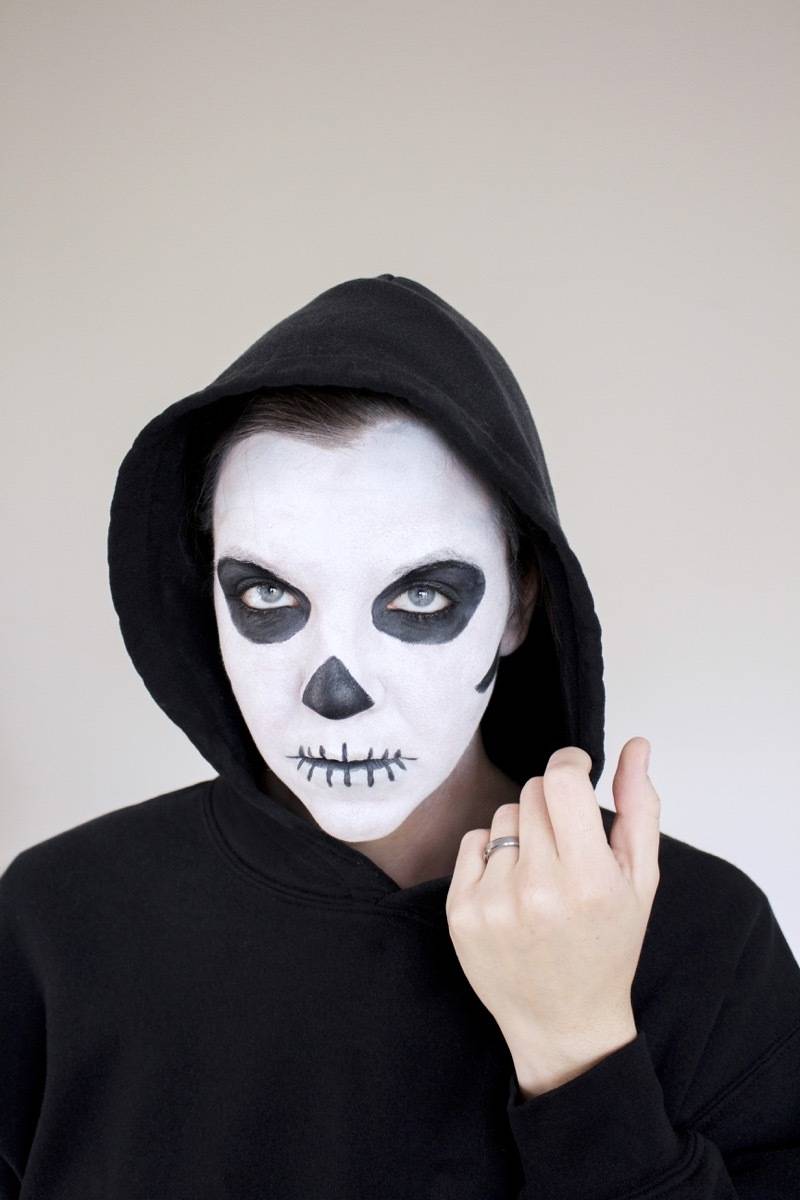 3. Skeleton: I think the skeleton is such a classic because it’s a breeze to do last-minute (I speak from personal experience with this one!). Start by applying white face paint with a sponge, then add black with a paintbrush. I actually drew in the eye sockets, nose, and teeth with eyeliner before filling them in with face paint, but that’s not necessary. Throw on a black shrit and you’re ready to haunt the night.