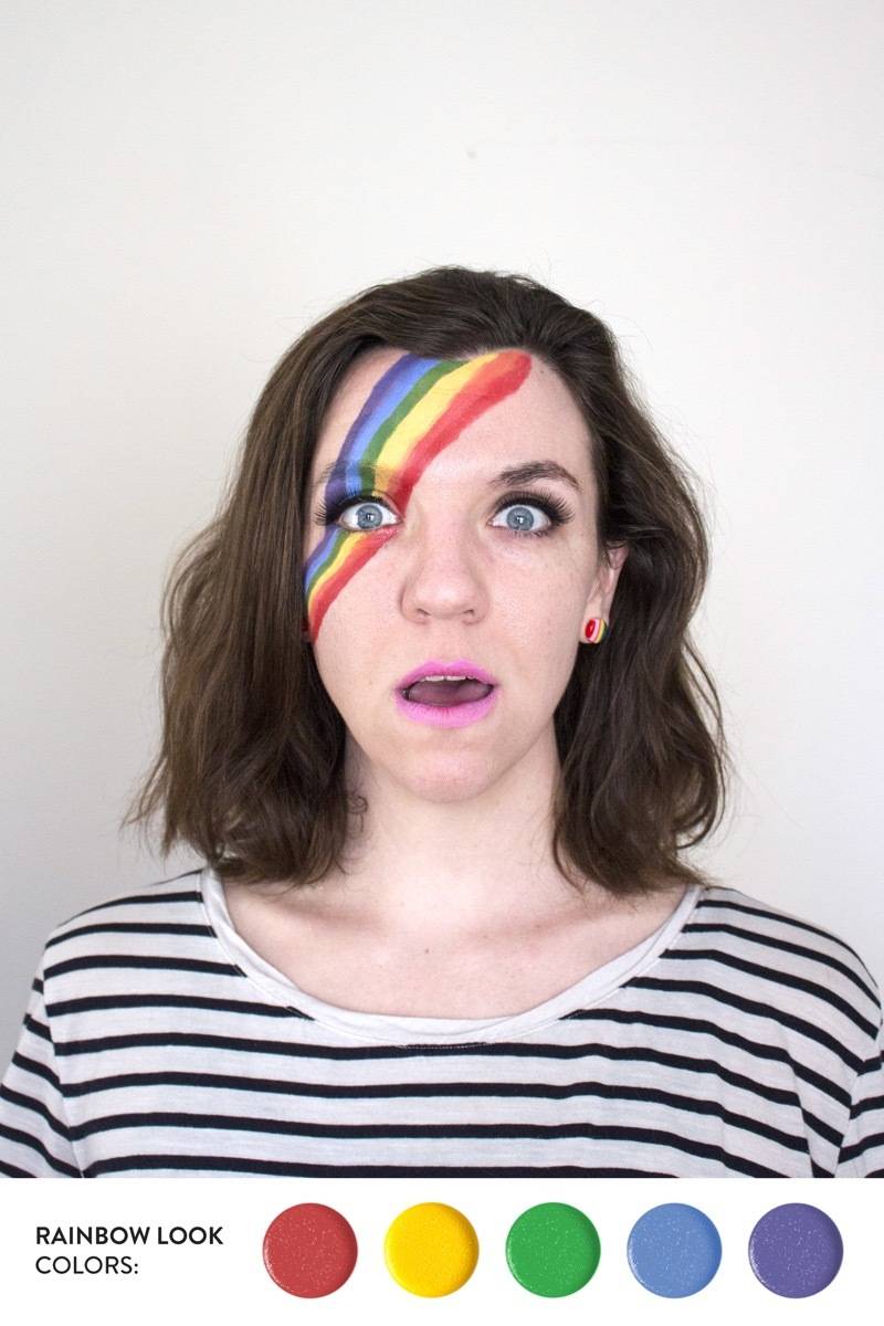 1. Rainbow: You can quickly be a happy little rainbow with a few streaks of color across your face. I added a bit of pink face paint to my lips, too, for even more color. Apply face paint with a paint brush, being careful of the eyes.