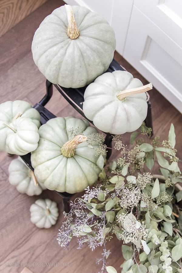 6. For a muted color scheme, try seeded eucalyptus and light colored heirloom pumpkins. Check out the whole look here.