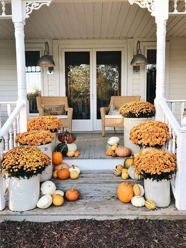 Get the fall celebration started outside your front door. For decorating your porch or yard for fall, start with buckets, baskets, crates, or planters. Add flowers, gourds, pumpkins, cornstalks, hay, and garlands, wreaths, and whatever else strikes your fancy. Depending on your style, keep it simple and monochromatic, or go for typical fall colors. Here are a bunch more inspiring outdoor fall decorating ideas: