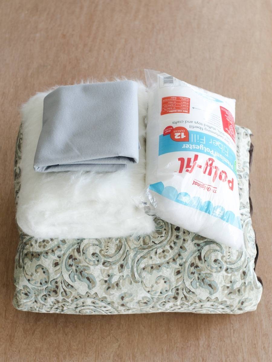 Now to fill! The density of the pouf will be based on how much you stuff inside it. I.e., the more tightly packed the materials inside, the firmer the pouf will be. You can fill the pouf with any old blankets, towels, pillows, etc. To even out the shape of the pouf, fill any holes and corners will poly-fil.