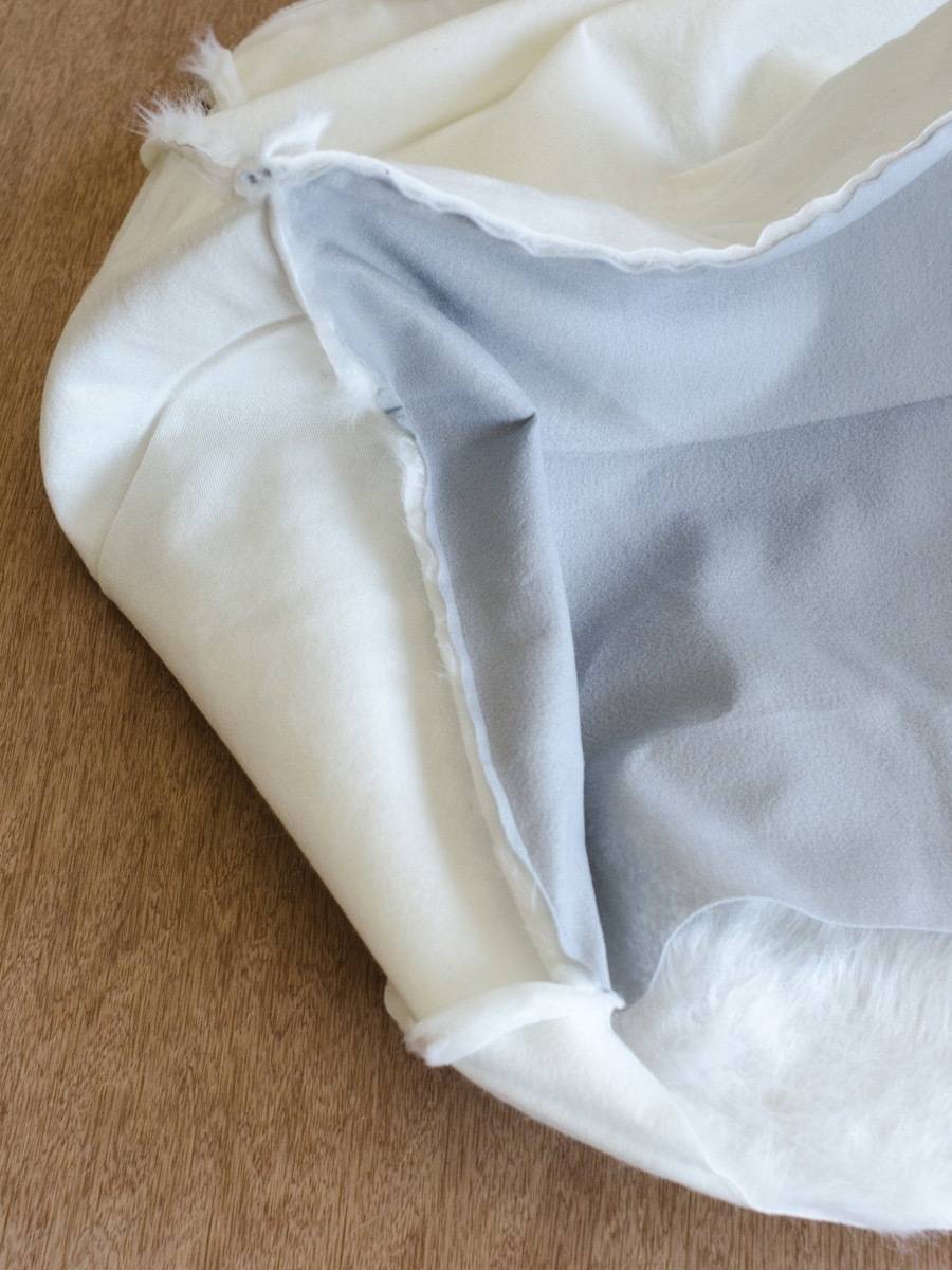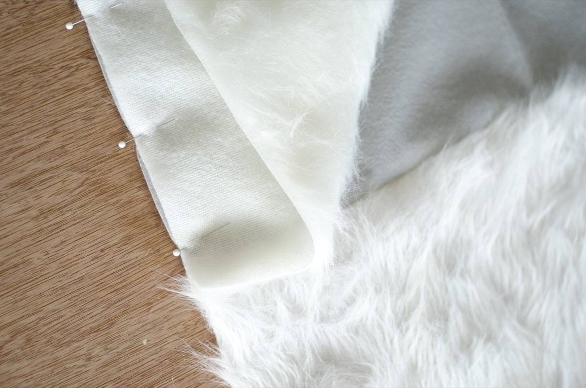Leave one side of the felt panel open for stuffing. When all the sides (except for this one) have been sewn together, turn the shell of the faux fur pouf inside out.