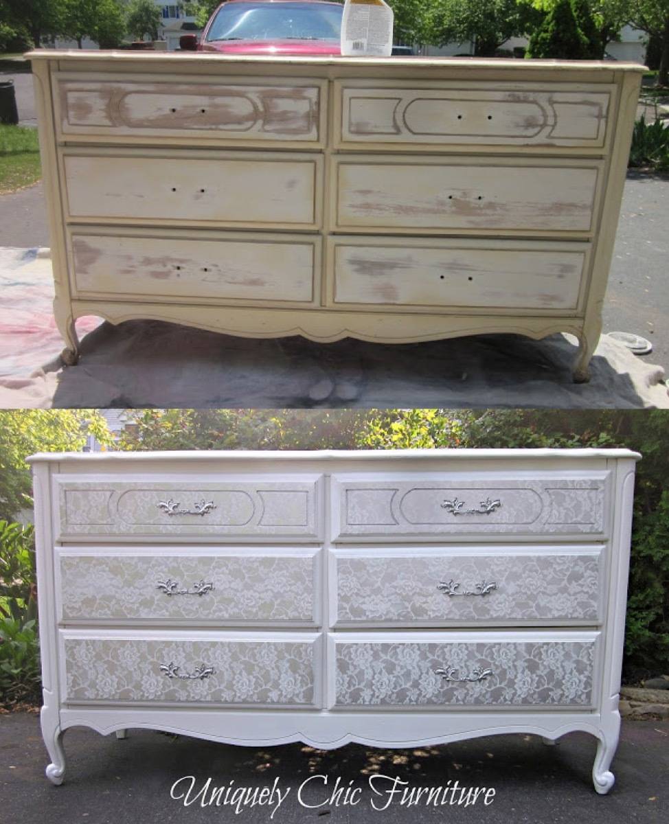 Uniquely Chic Furniture uses lace as a stencil to give this piece a shabby chic look.