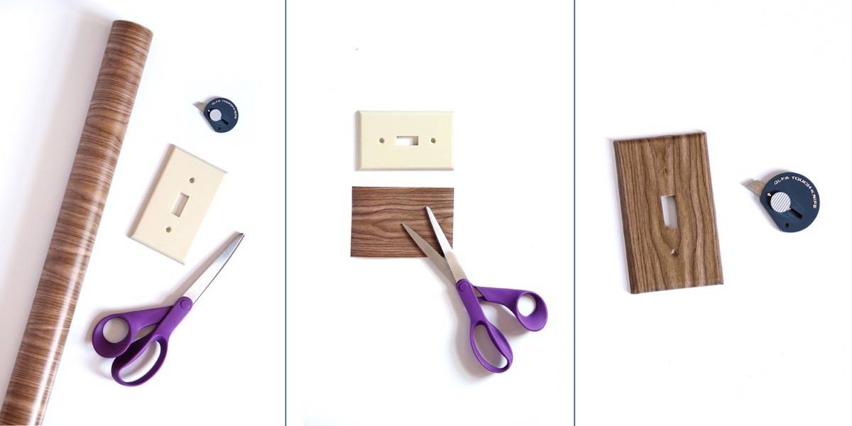 Before applying contact paper, unscrew the light switch plate from the wall. Cut a piece of contact paper large enough to cover the face and sides of the plate. Stick the contact paper to the plate, smoothing out any bubbles as you go. Cut a small slit at each corner, and fold all the sides down. Trim any excess paper, then cut an opening for the light switch and screws with a craft knife.