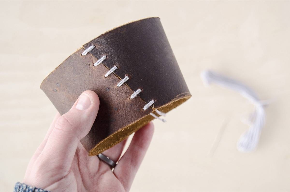 Thread your needle with embroidery floss, and stitch into one of the bottom holes. Leave a few inches of floss at the first hole (so you can tie it up at the end). Stitch across as you go up the edge of the cuff, joining the strap together. Once you’ve reached the top, turn around and stitch down, going through each pair of holes again. Once you’ve reached the bottom, tie the ends of the thread together in a knot.