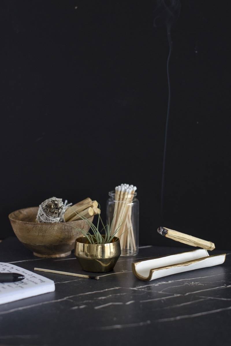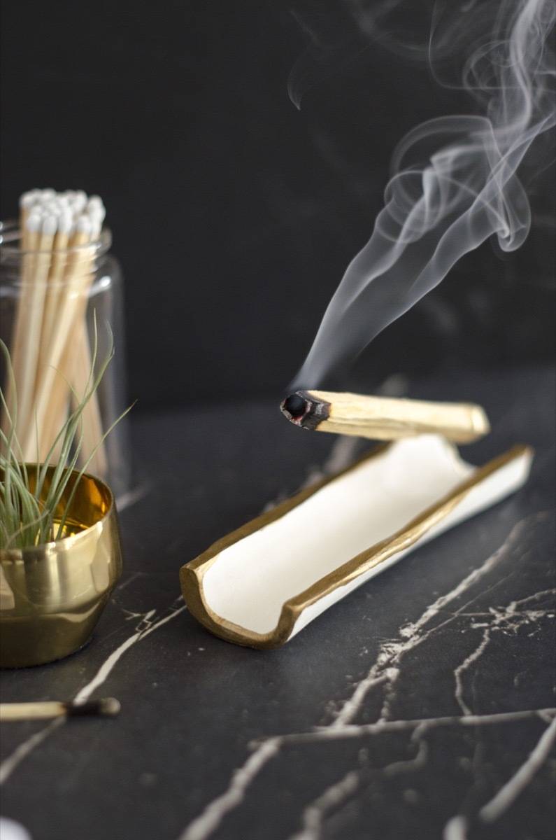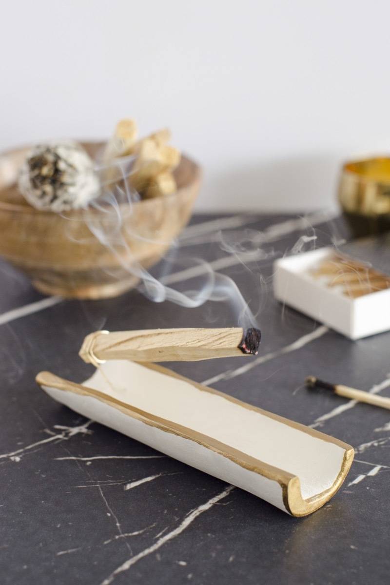 Okay, you have your palo santo, now where to burn it? You want to set it in a non-flammable vessel like a dish or shallow bowl, as it will produce hot ash. Or, you can go one step further and make a simple palo santo holder like this one:
