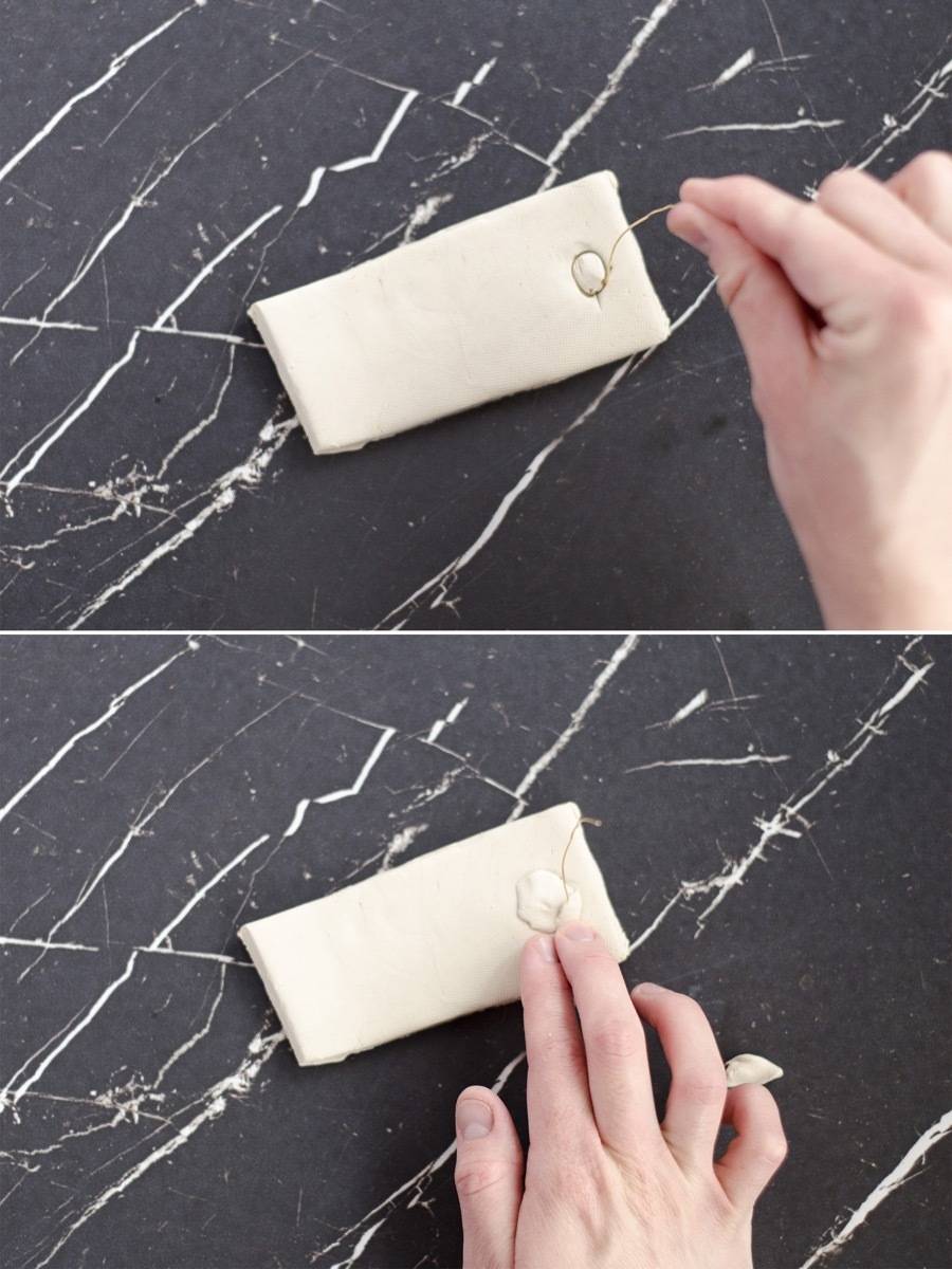 Press the circular end of the wire into the slab of clay, towards one end of the slab. Press it in until the base almost reaches the bottom, but doesn’t show through. Next, use a little clay to cover the base of the wire. Smooth out with your fingers.