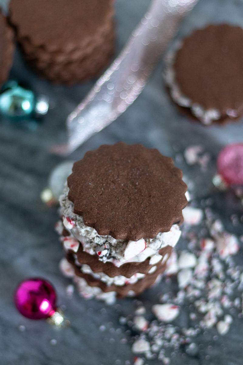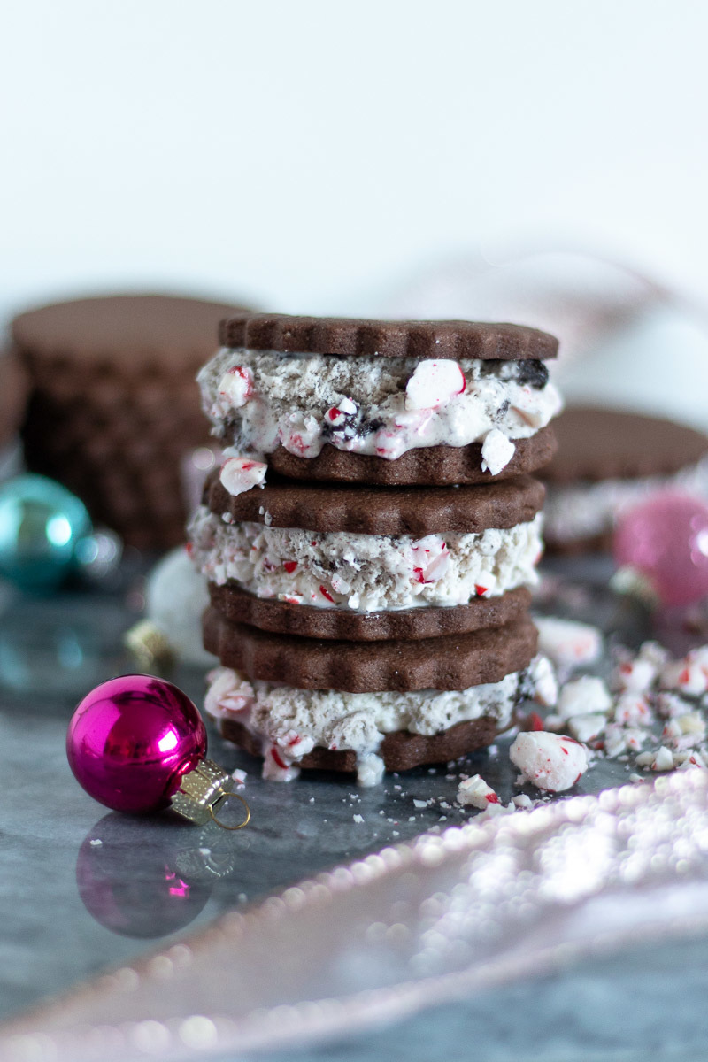 ‘Tis the season for all things peppermint and I am HERE FOR IT! If you’re a kid at heart like me, you know that it’s never too cold for ice cream, so these homemade peppermint Christmas cookie ice cream sandwiches are the perfect way to celebrate the season. Made with homemade chocolate peppermint sugar cookies cut into scalloped circles, you can use ANY ice cream flavor for the filling and roll the finished ice cream sandwiches in crushed peppermint. Try them with traditional vanilla or cookies & cream ice cream for delicious combos!