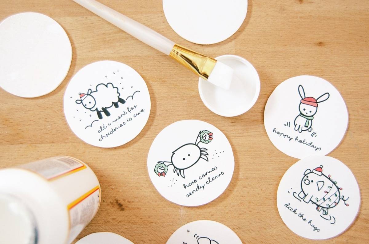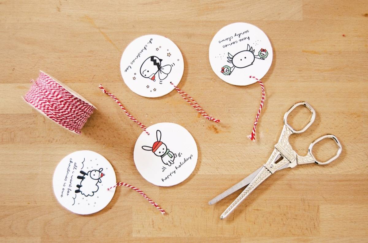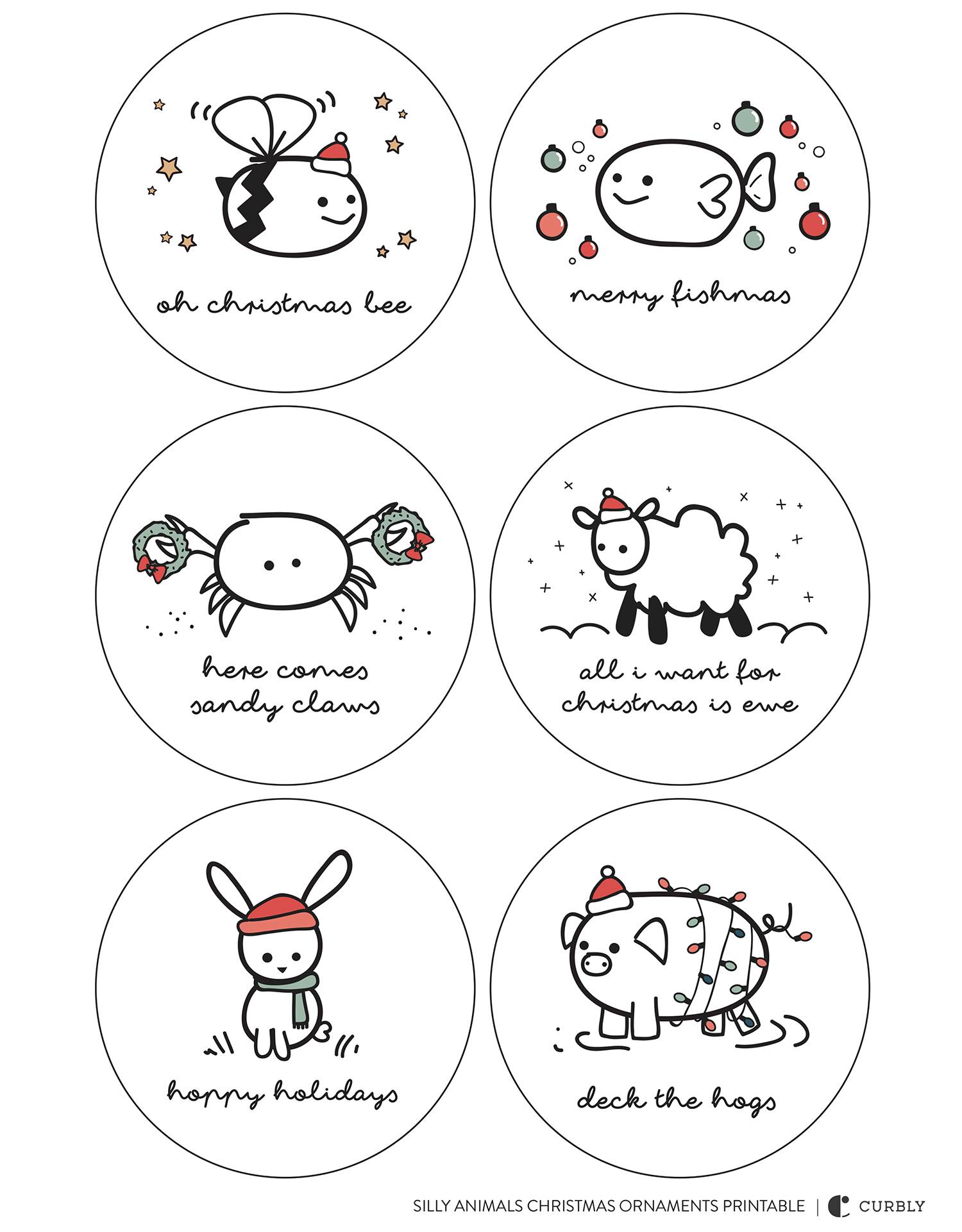 Download the punny Christmas ornaments printable template, and print on white cardstock. Cut out the designs, cutting just inside the outline of each.