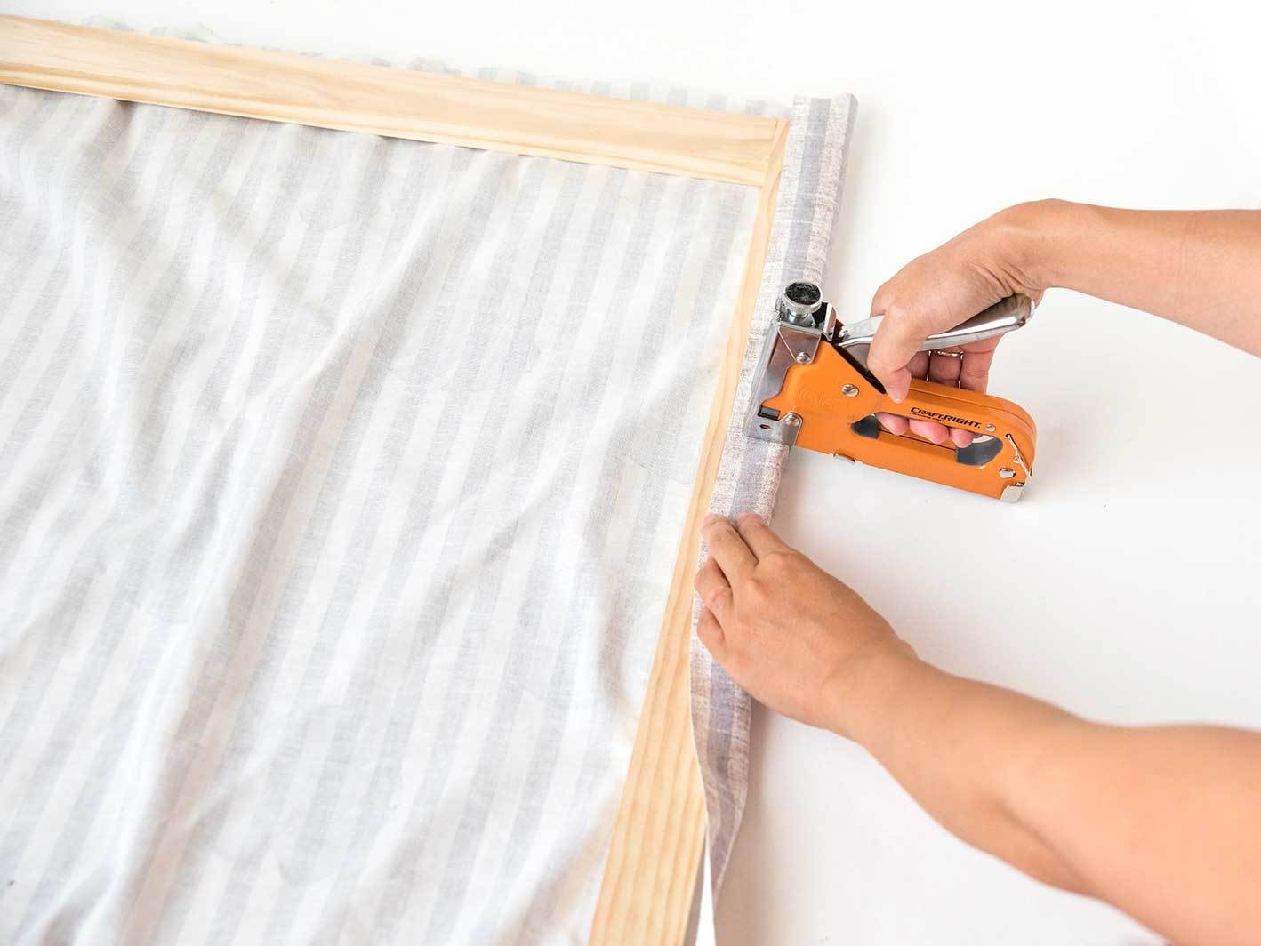 Repeat this process on the opposite side of the frame so that the fabric is pulled taut across the wood. Then do the two remaining sides.