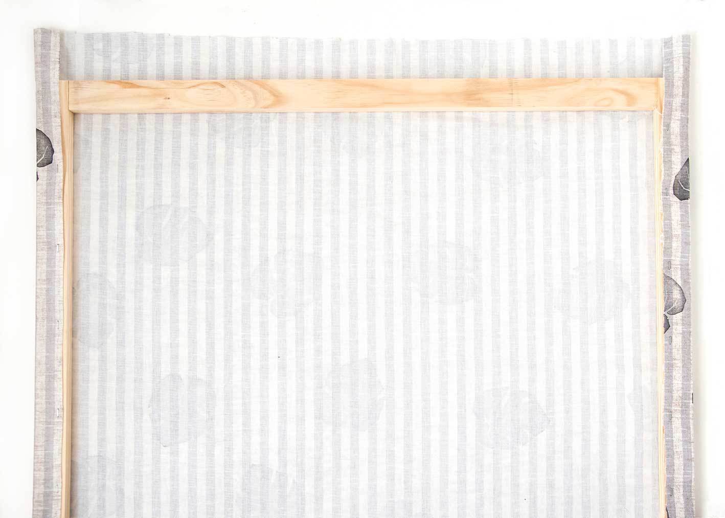 Lay your stamped fabric face down and place your wood frame on top. Pull one edge of the fabric over the side of the wood frame and using a staple gun to staple it to the back of the wood.
