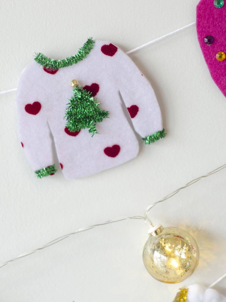 Cut pieces of felt and glue them to the sweaters – like a stocking, present, tree, or star shape.